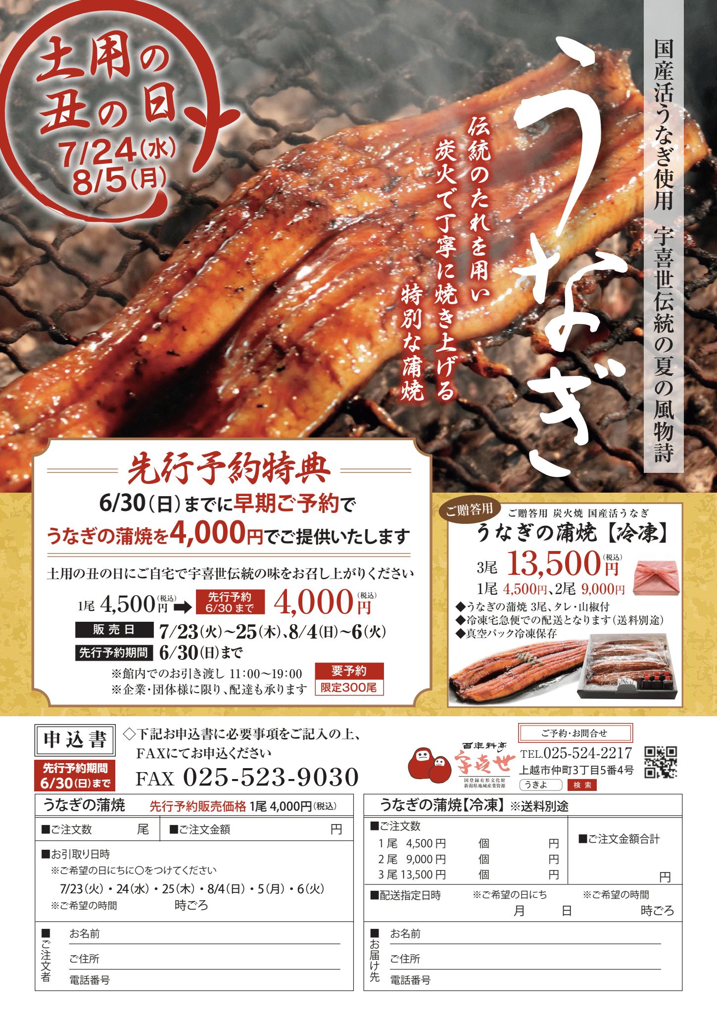 「土用の丑の日」ご予約・お申込みは、添付の申込書よりFAXにて承ります。